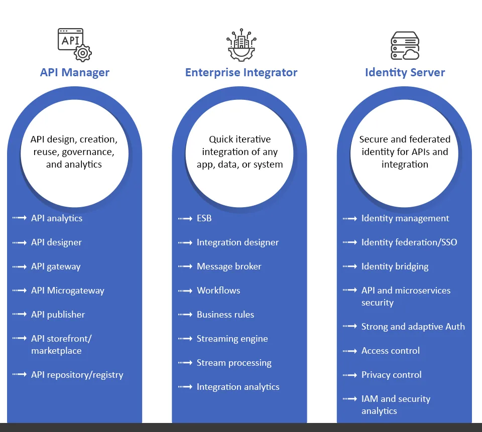 The three main pillars comprise WSO2’s integration platform include – API Manager, Enterprise Integrator, and Identity Server.