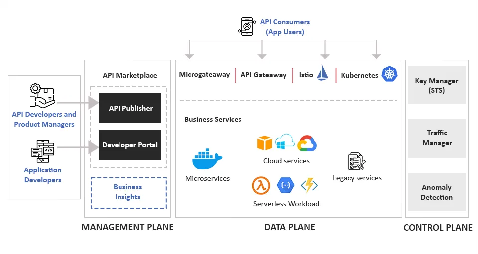 API Manager provides full API lifecycle management, monetization, and policy enforcement, with the main components grouped intuitively into a management plane, a data plane, and a control plane for API design, creation, reuse, governance, and analytics.